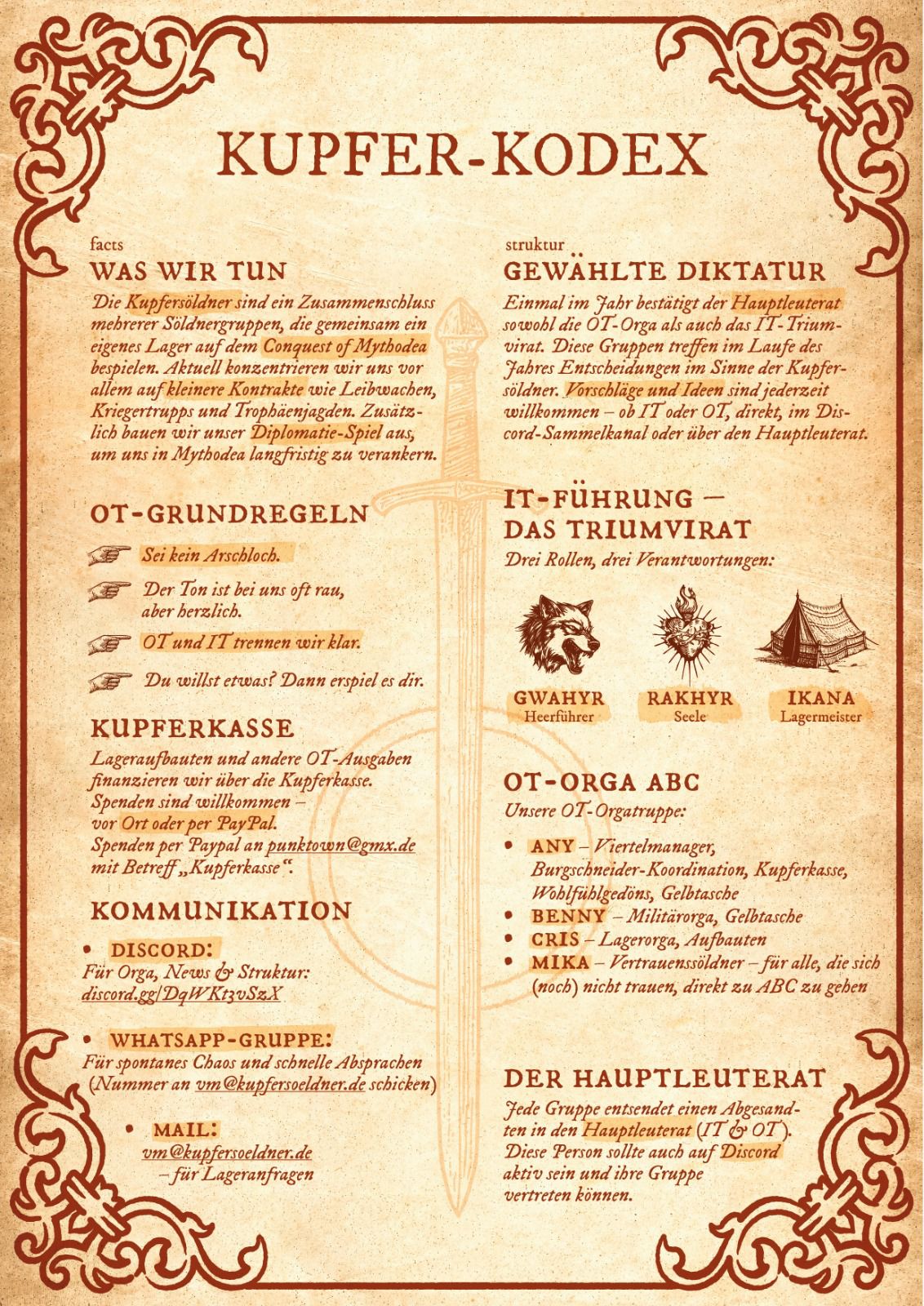 DiscordIhr habt Anfragen zur Lagerwahl oder zu unserem Platz auf dem Conquest of Mythodea? Ihr wollt bei uns lagern? Schreibt uns eine Mail an vm(at)kupfersoeldner.de.
